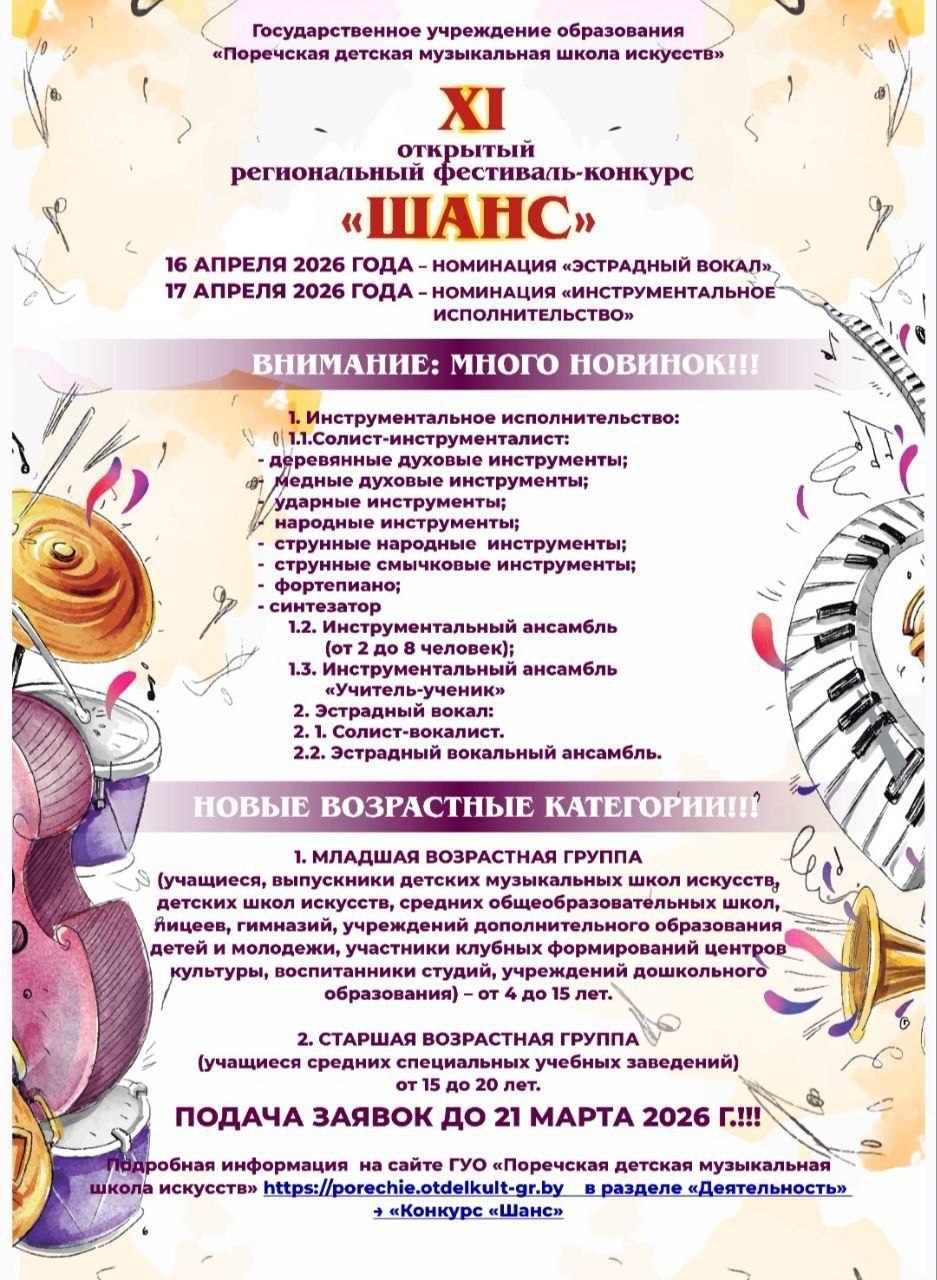 17 апреля в агрогородке Поречье состоялся XI открытый региональный фестиваль-конкурс «Шанс». Сразу 13 учащихся нашей школы, из них 4 по фортепиано, 4 по синтезатору, 3 по цимбалам и 2 по аккордеону, выступили на этом творческом состязании. Дипломы лауреата 1 степени получили 2 учащихся, дипломы лауреата 2 степени - 10 учащихся и диплом лауреата 3 степени - 1 учащаяся. Поздравляем наших юных конкурсантов с успешным выступлением!