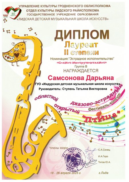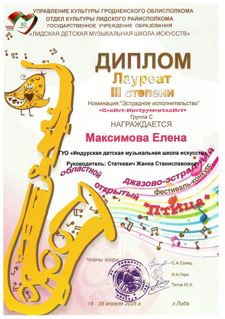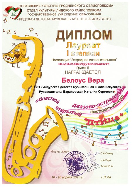 На областном открытом джазово-эстрадном фестивале-конкурсе "Птица", который проходил 26 апреля в ГУО "Лидская детская музыкальная школа искусств" в номинации "Эстрадное исполнительство. Солист-инструменталист" успешно выступили наши учащиеся: Белоус Вера, фортепиано, лауреат 1 степени (учитель Барановская Наталия Сергеевна), Самсонова Дарьяна, цимбалы, лауреат 2 степени (учитель Ступень Татьяна Викторовна), Максимова Елена, аккордеон, лауреат 3 степени (учитель Статкевич Жанна Станиславовна).