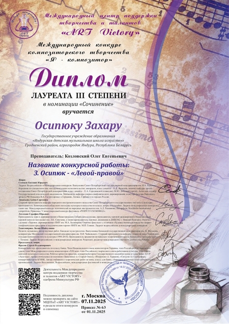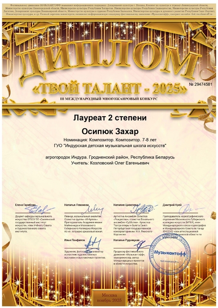 На Международном многожанровом конкурсе "Твой талант" и Международном конкурсе композиторского творчества "Я-композитор" успешно выступил учащийся 1 класса Осипюк Захар (учитель Козловский Олег Евгеньевич), который стал лауреатом 2 и 3 степени в номинации "Композитор".