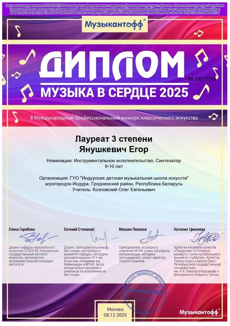 Учащиеся школы Осипюк Захар и Янушкевич Егор (учитель Козловский Олег Евгеньевич) стали лауреатами Международного профессионального конкурса классического искусства "Музыка в сердце" в номинации "Инструментальное исполнительство. Синтезатор".