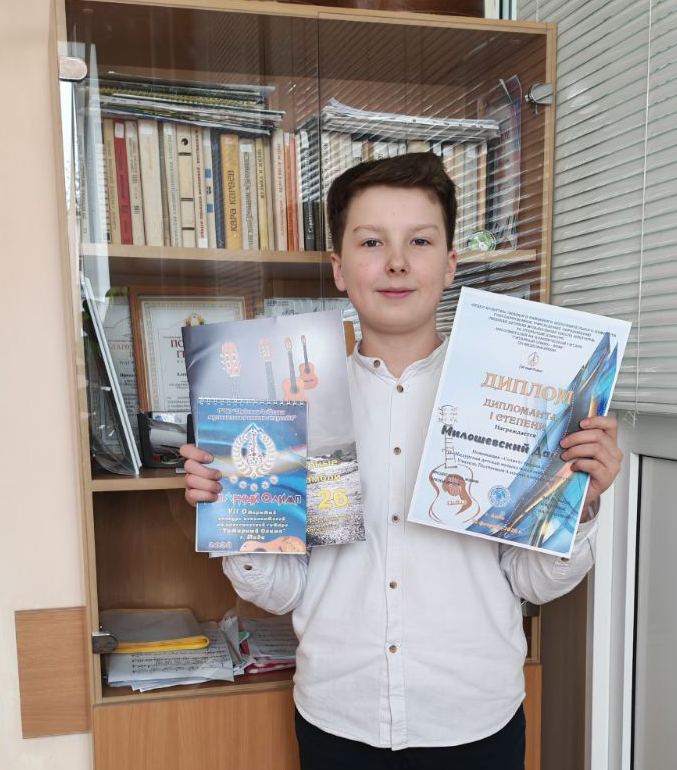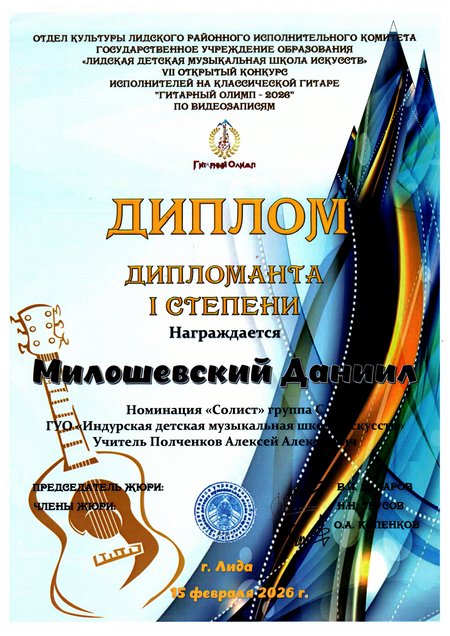 15 февраля в г. Лида состоялся VII открытый конкурс исполнителей на классической гитаре «Гитарный Олимп». Организаторами конкурса являются отдел культуры Лидского районного исполнительного комитета и государственное учреждение образования «Лидская детская музыкальная школа искусств». В конкурсе принимали участие свыше 50 солистов и ансамблей со всей страны. Успешно выступил учащийся класса гитары нашей школы Милошевский Даниил, который стал дипломантом 1 степени (учитель Полченков Алексей Алексеевич).