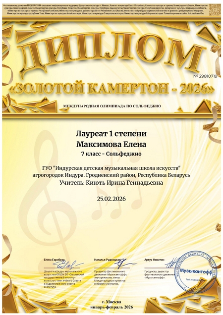 Приятным событием стало успешное выступление учащихся школы Максимовой Елены и Кондратовича Владислава на Международной олимпиаде по сольфеджио "Золотой камертон". Наши юные теоретики, которых подготовили учителя вокально-хоровых и музыкально-теоретических дисциплин Киють Ирина Геннадьевна и Молошникова Инна Владимировна, получили дипломы лауреата 1 степени.