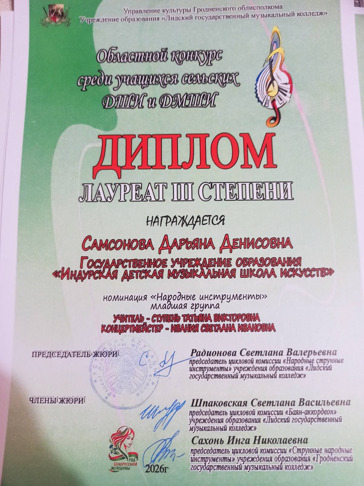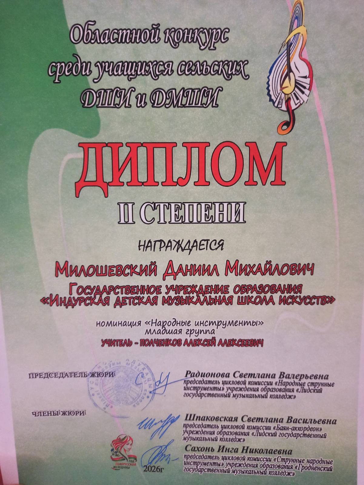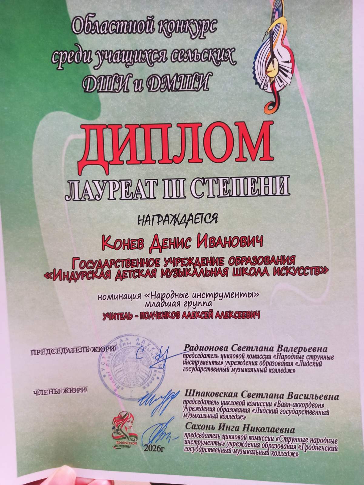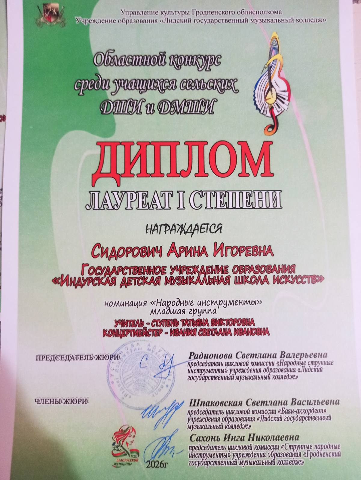 29 апреля на базе Лидского государственного музыкального колледжа состоялся областной конкурс среди учащихся сельских детских школ искусств и детских музыкальных школ искусств. Все участники показали невероятный талант и мастерство! И мы с радостью объявляем и поздравляем победителей! В номинации «Народные инструменты» успешно выступили учащиеся нашей школы: Лауреат 1 степени учащаяся класса цимбал Сидорович Арина, лауреат 3 степени учащаяся класса цимбал Самсонова Дарьяна (учитель Ступень Татьяна Викторовна, концертмейстер Ивания Светлана Ивановна), лауреат 3 степени учащийся класса гитары Конев Денис, дипломант 2 степени учащийся класса гитары Милошевский Даниил (учитель Полченков Алексей Алексеевич).